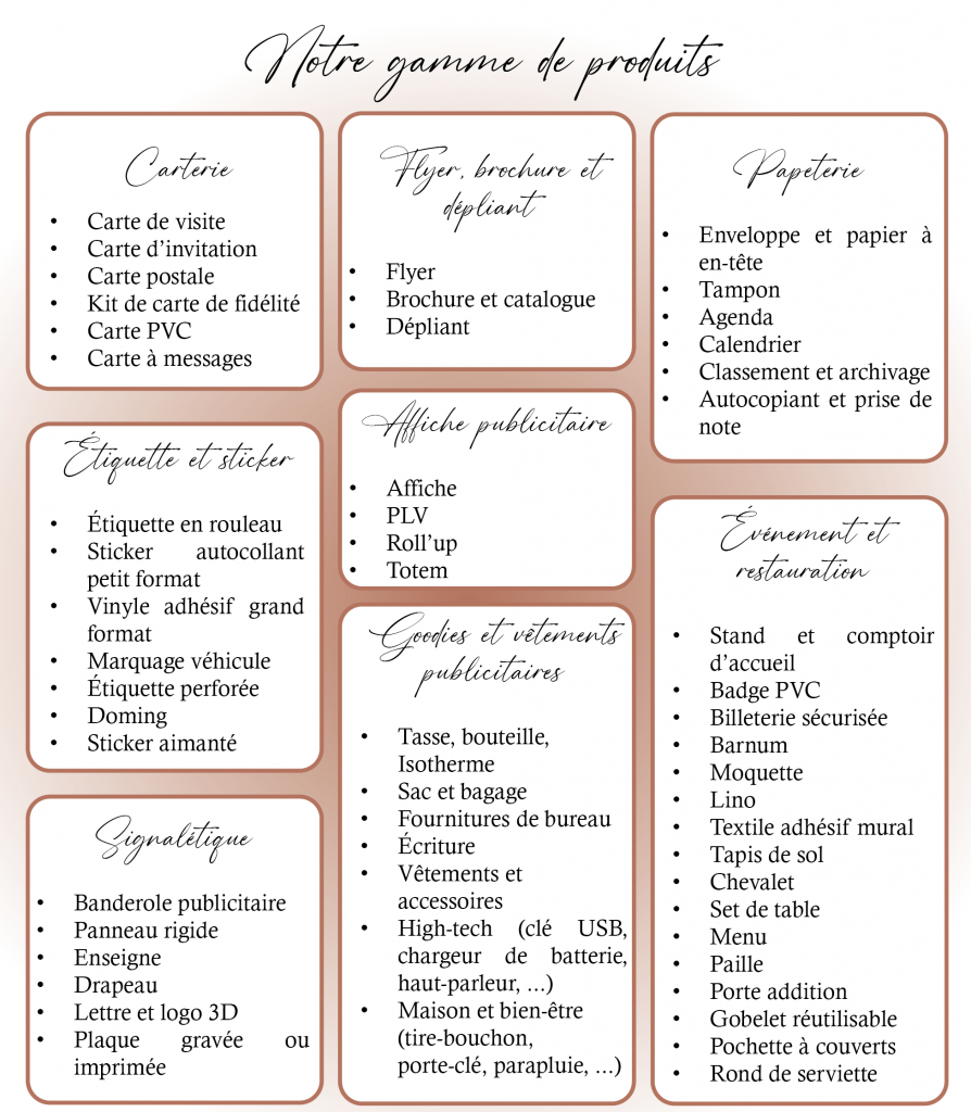 PRINT Du design à l’impression, je m’occupe de tout.Je vous propose une large gamme de produits pour booster votre image et votre communication ! Besoin d'un renseignement, obtenir un devis ? N’hésitez pas à me contacter pour échanger sur vos besoins, et les produits 100% personnalisables. Contactez moi